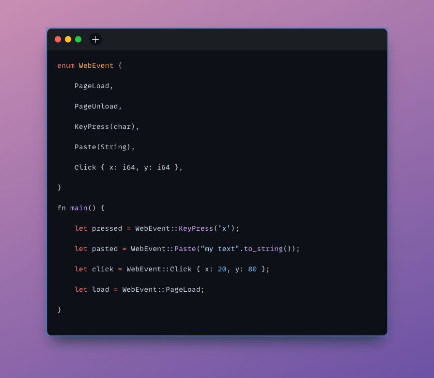 Each variant of the `WebEvent` enum can store different types and amounts of data. `KeyPress` variant holds a single `char`, `Paste` wraps a `String`, and `Click` contains an anonymous struct with two `i64` values.