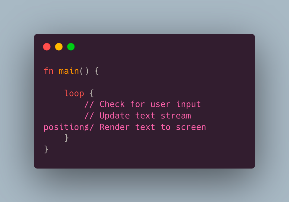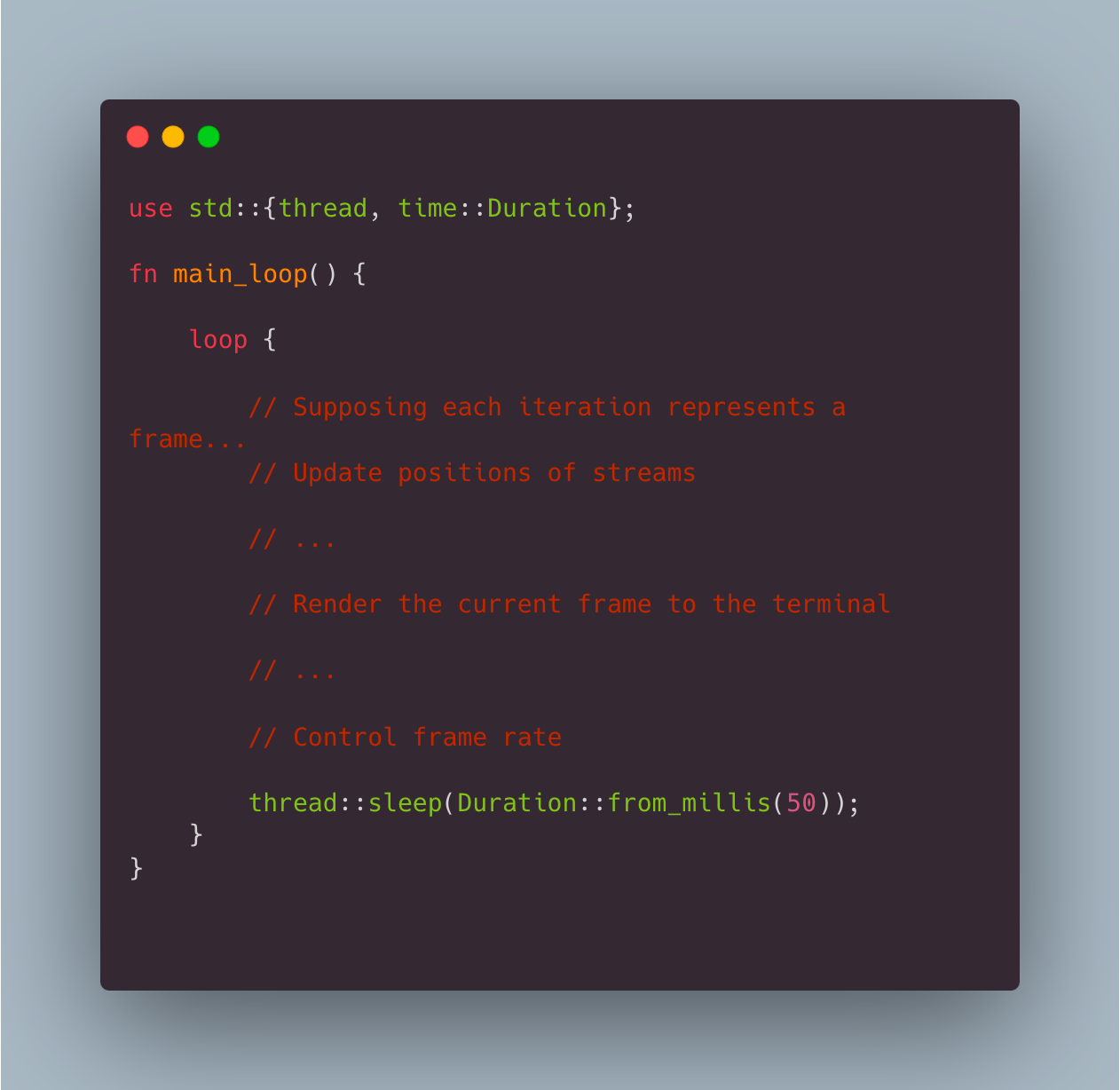 We start with the application architecture. The core of our program is the main loop. This loop checks for user input (to quit or adjust the speed of the text, for example), updates the positions of our text streams, and renders the output to the screen. We'll use Rust's standard library to handle user input and manage the screen display.