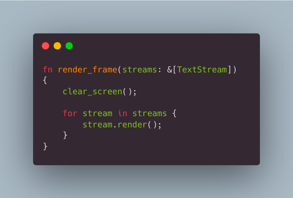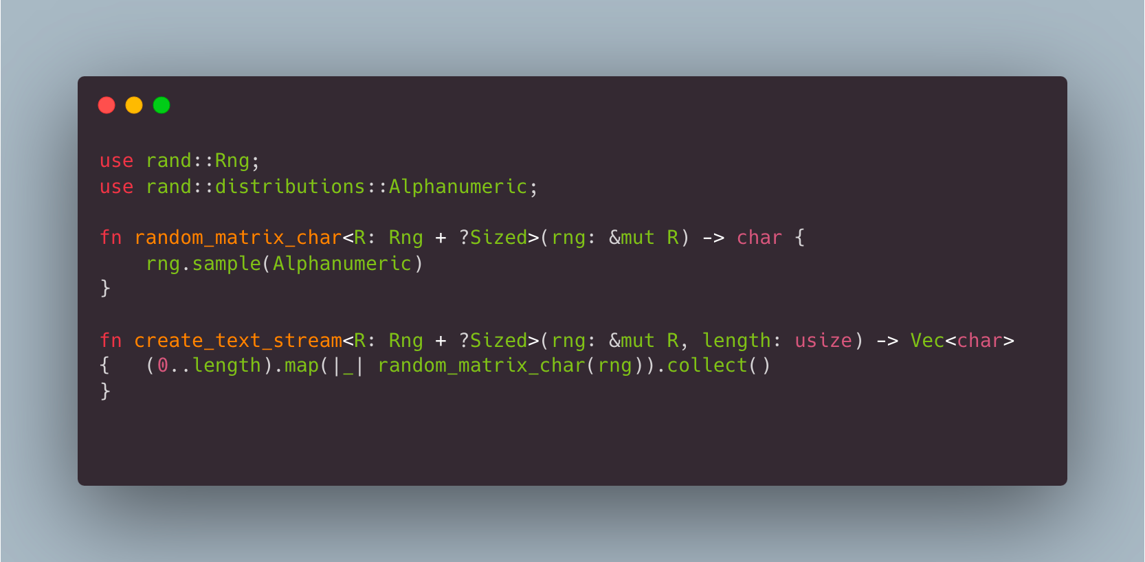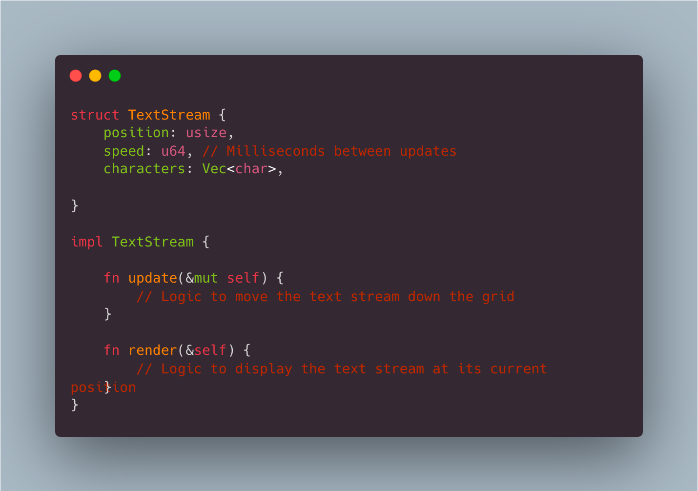 2. Text Stream Handling: Each text stream (column) will be an object we create, with properties for its current position, speed, and the characters it contains. Since the effect benefits from parallelism, we might use Rust's `thread::spawn` to manage multiple streams simultaneously.