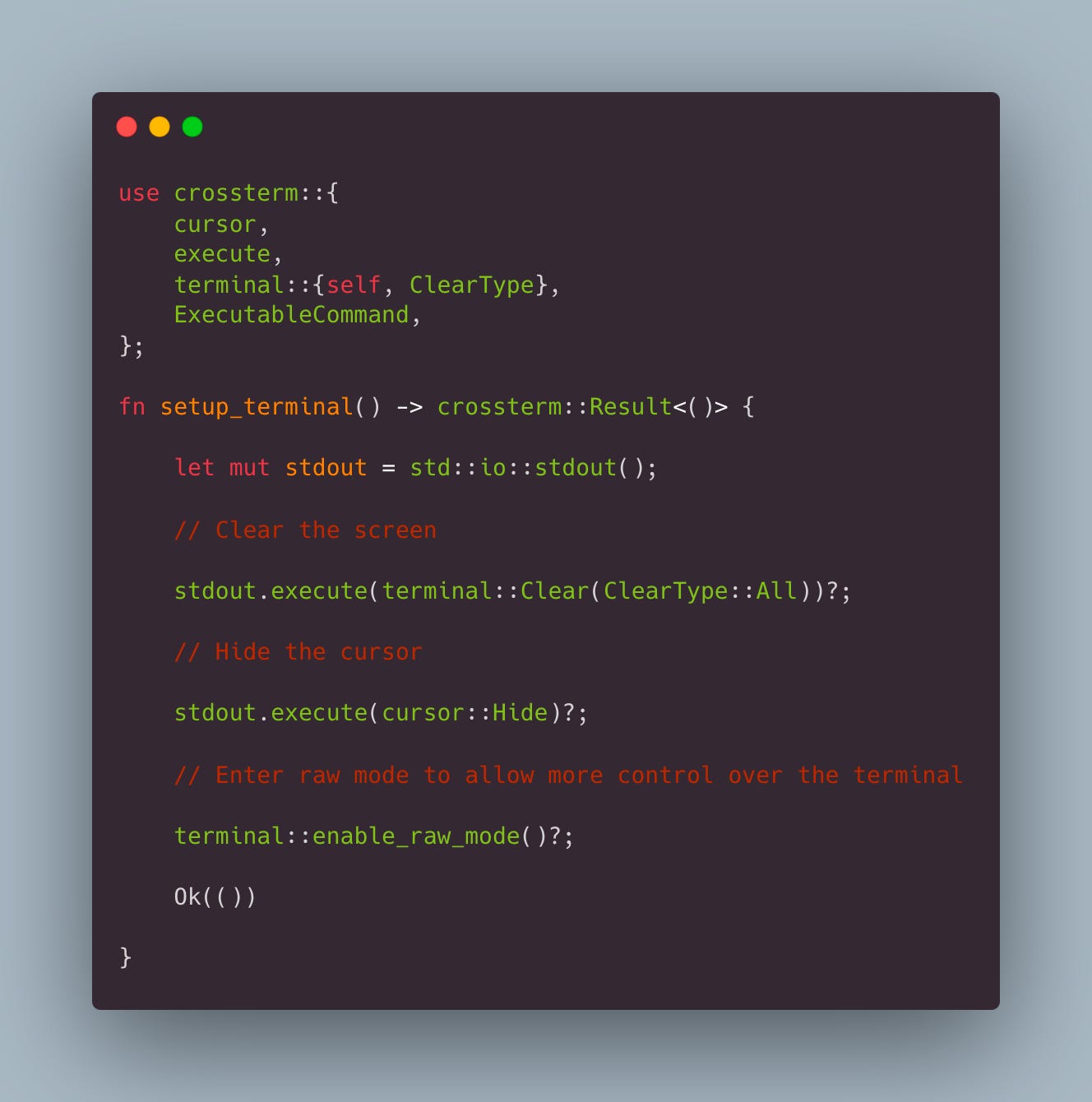 For the rendering, we'll likely rely on a crate like `crossterm` or `termion`, which provide the tools to control terminal output. These crates help us hide the cursor, paint characters in certain colors, and position text exactly where we want it to appear on the screen.