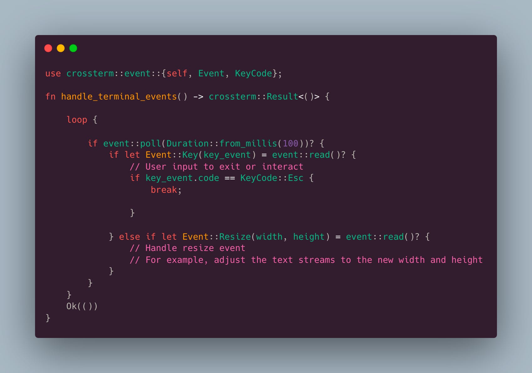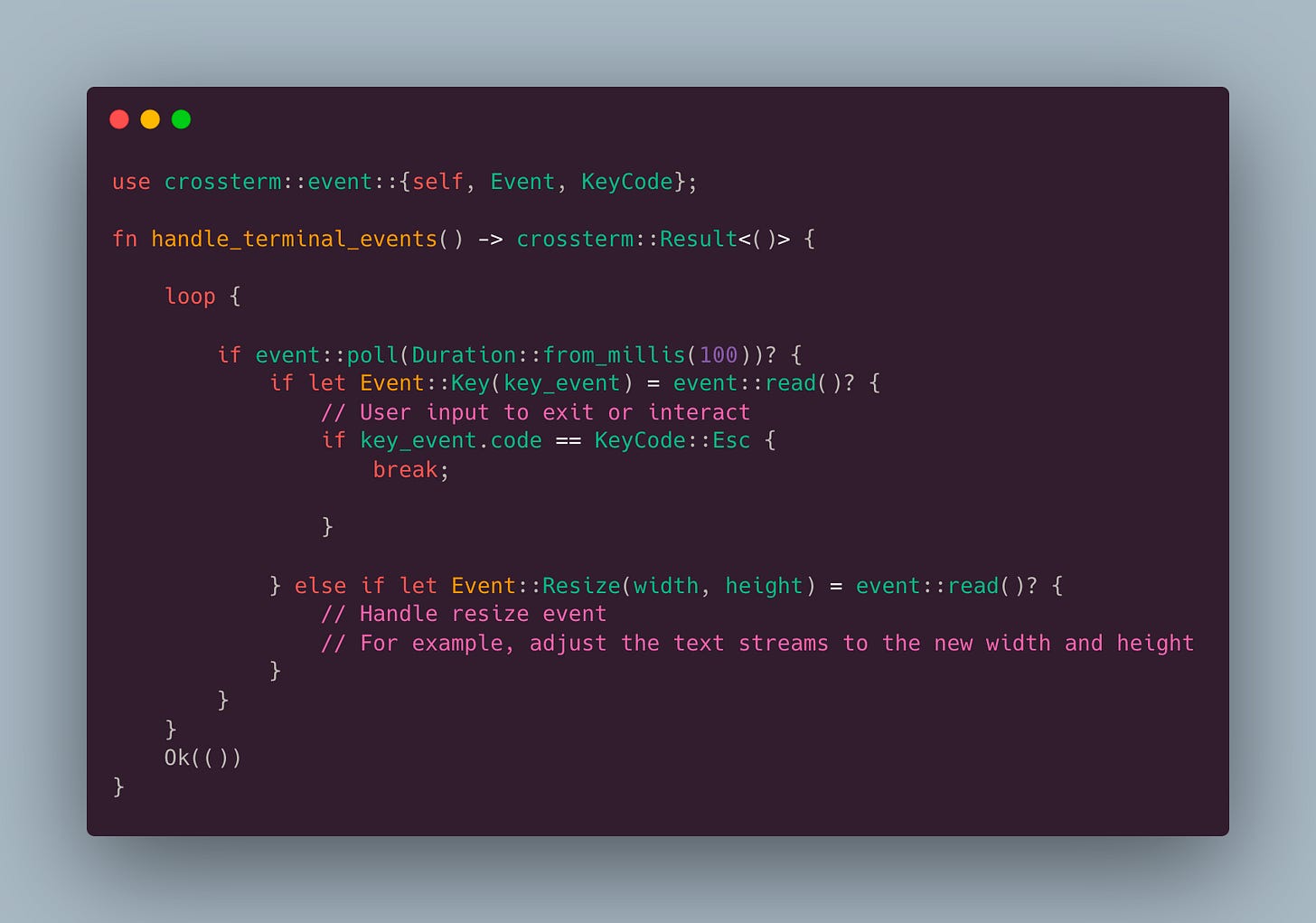 One nuance of terminal applications is dealing with window resizing. For the Matrix effect, we must constantly be aware of the terminal’s size. With `crossterm`, we can manage resize events efficiently: