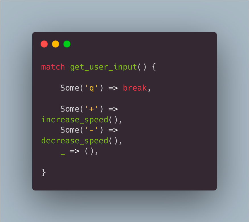 3. User Input Handling: We'll use non-blocking input to allow the user to affect the program without pausing the main loop. Rust's pattern matching can be utilized to make this control both elegant and robust.