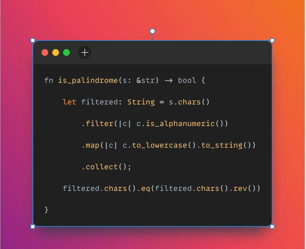 This bit of code is Rust in the embryonic stage. It takes a string, sanitizes it to ignore all but the alphanumeric characters, smothers case sensitivity, and then checks whether it reads equally from both ends.