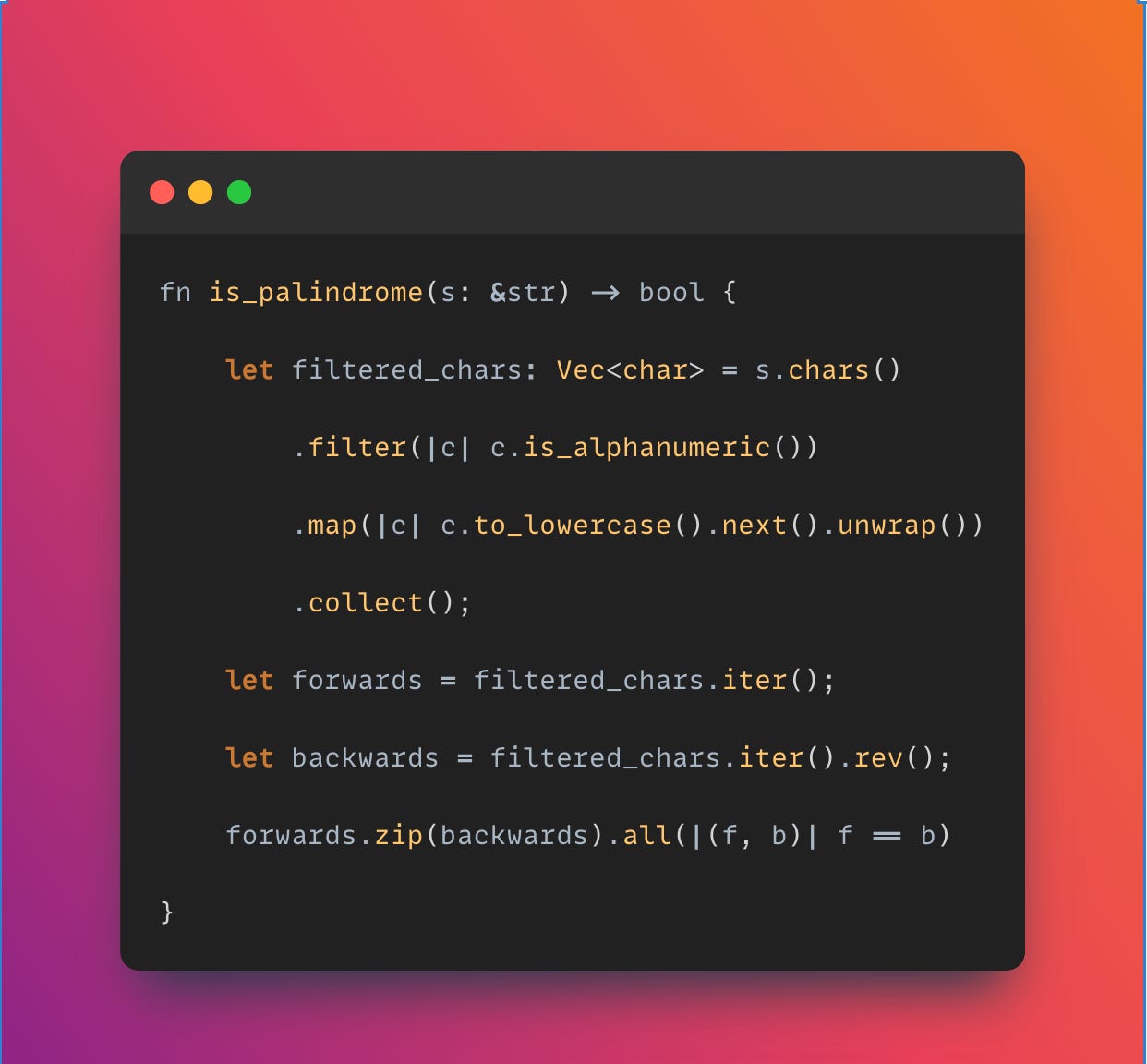 In the example, you notice `s` is taken as a string slice—Rust's way of borrowing data. Characters are filtered and converted without claiming ownership, ensuring safety. Pairing an iterator with its reverse twin and walking them together to compare each step, only if all corresponding characters match do we affirm the string's palindrome status.