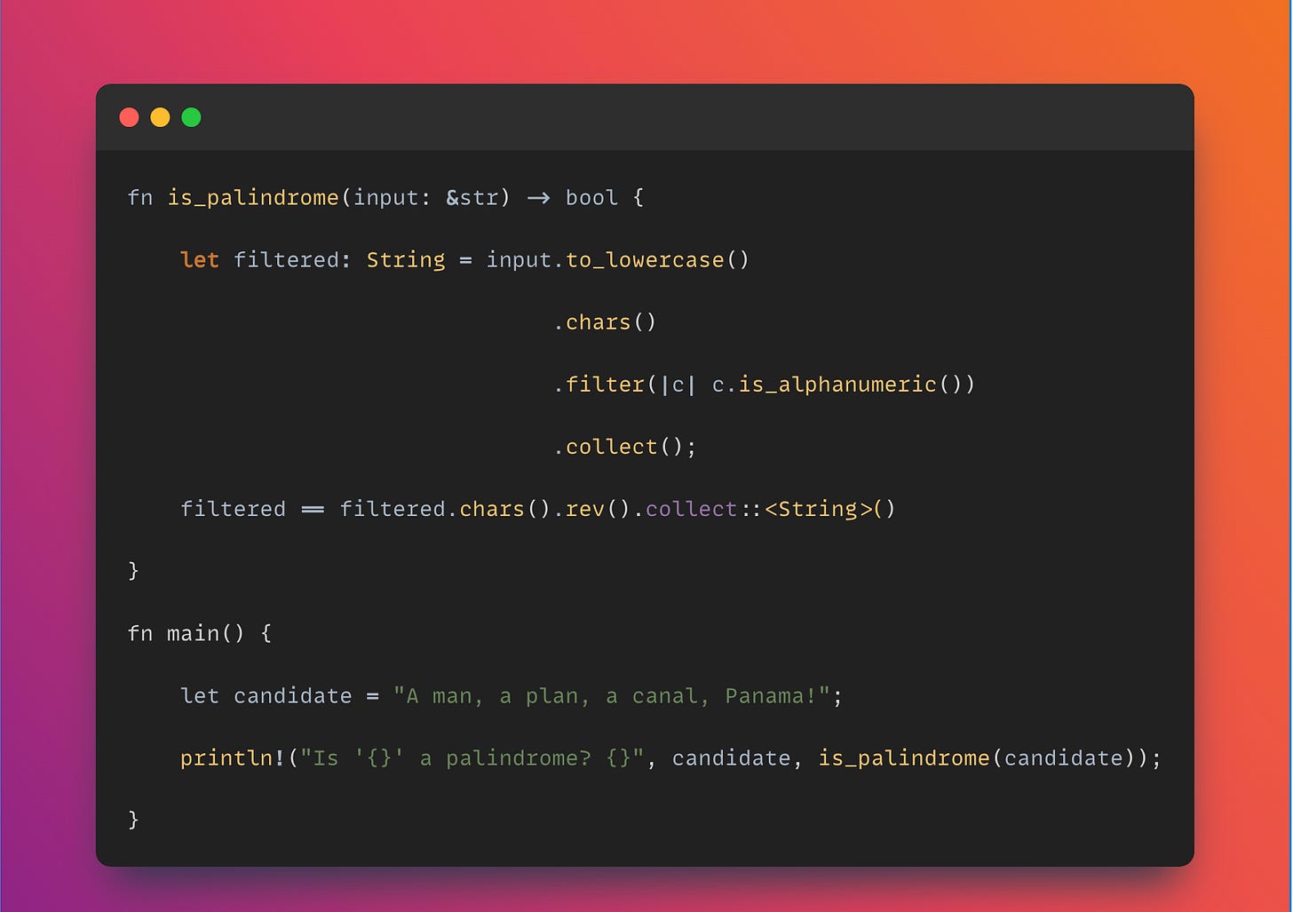 The palindrome problem has great educational value for Rust beginners. It touches on fundamental Rust concepts without overwhelming complexity. New programmers learn about iterators, character manipulation, and Rust's approach to memory safety, which are crucial for deeper language mastery.
