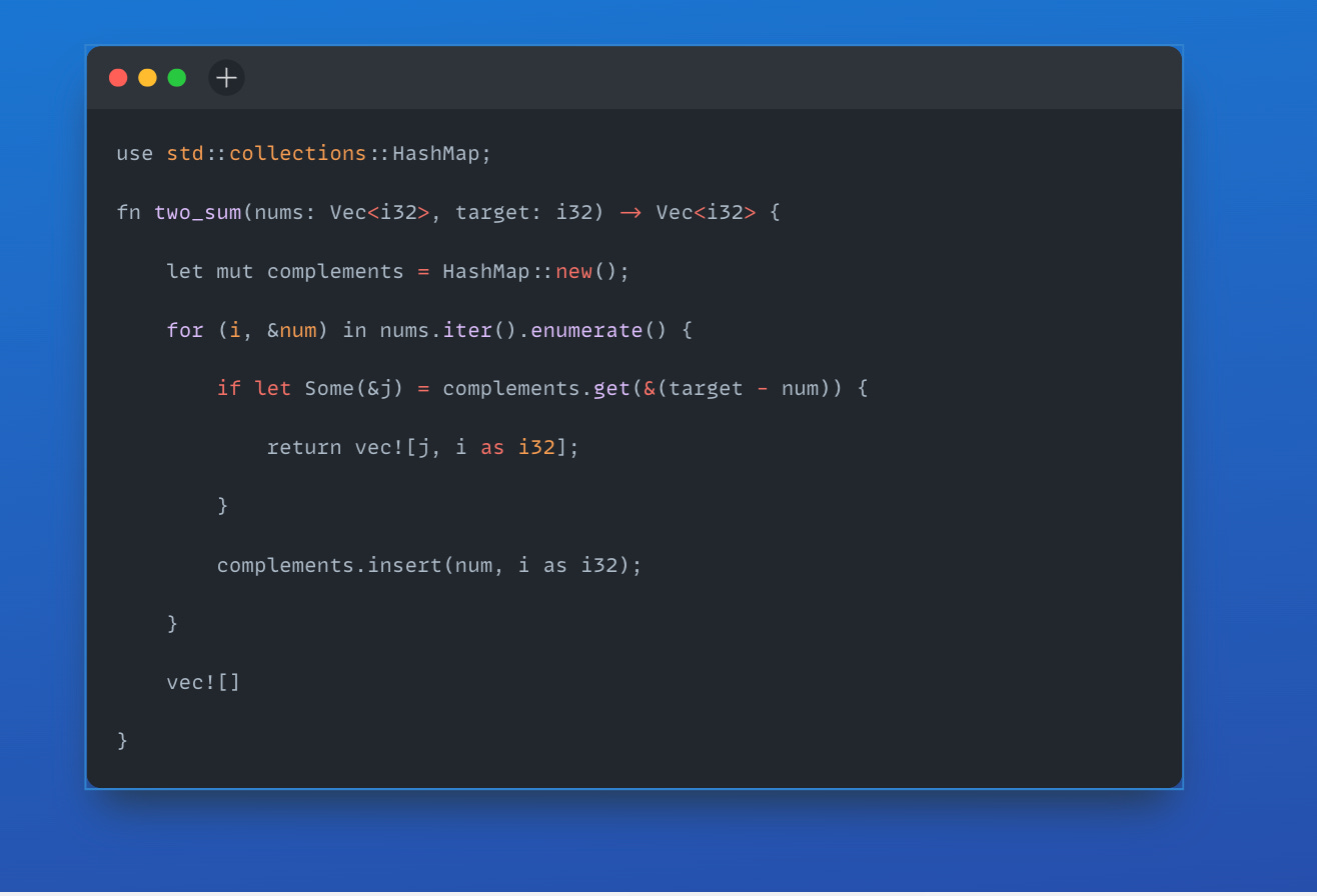 A HashMap is key to an efficient solution. It lets you quickly check if you have already encountered a number's complement – the number needed to reach the target sum when added to the current number. Here's what it might look like in Rust:
