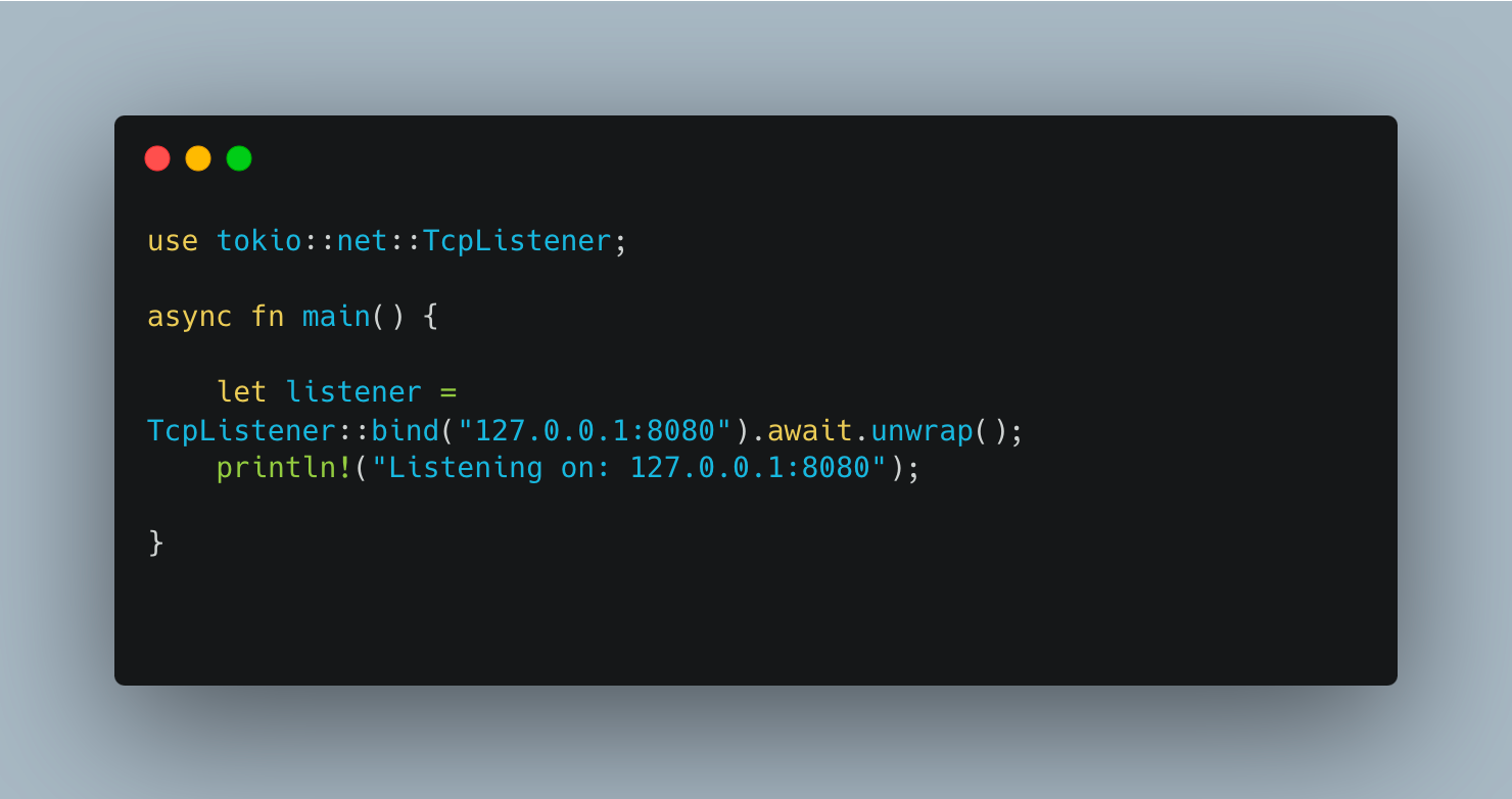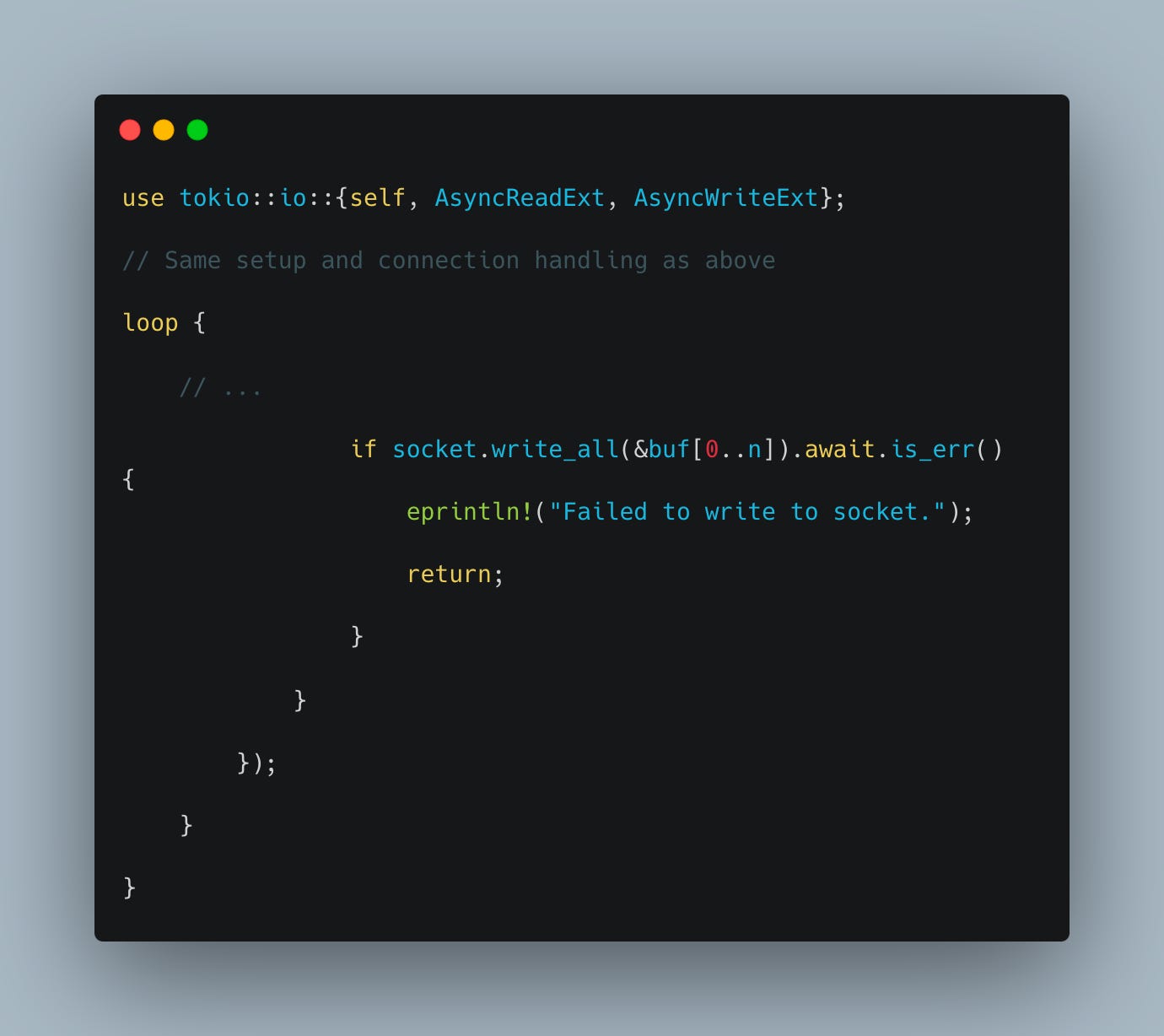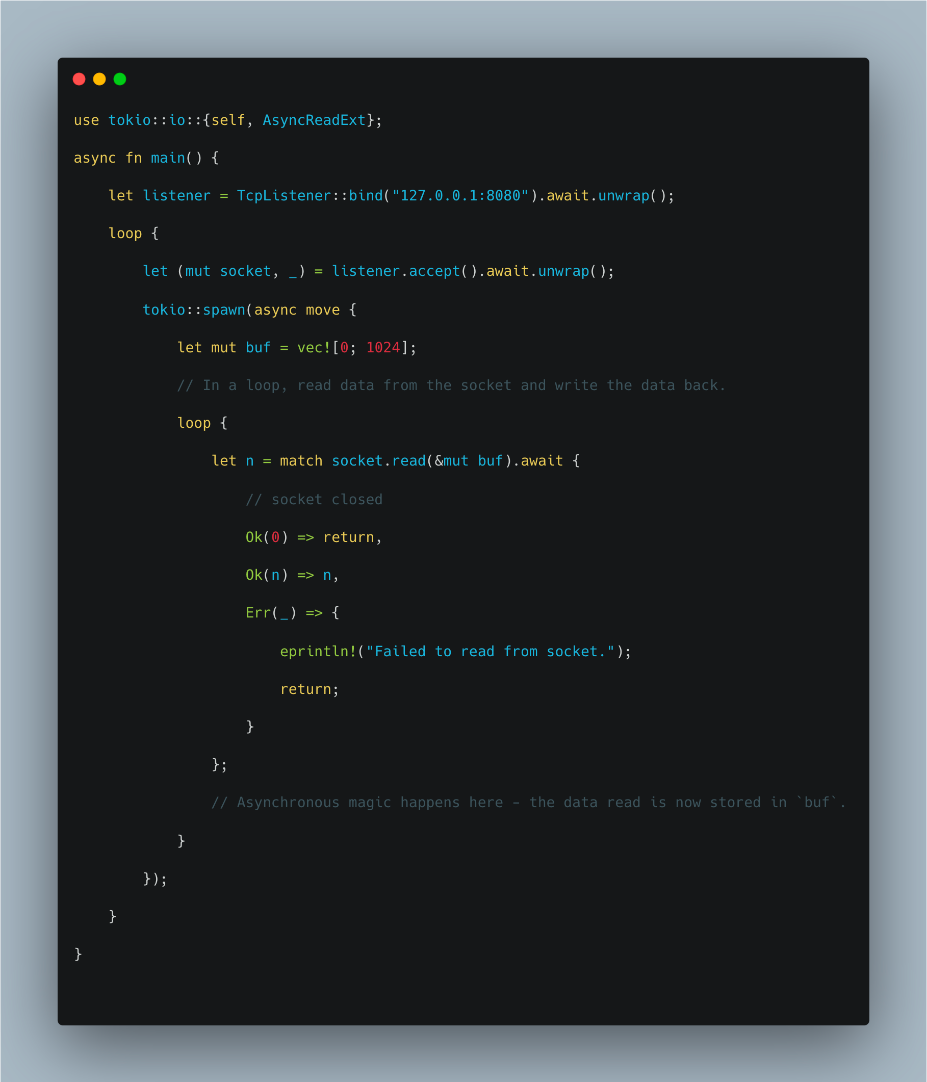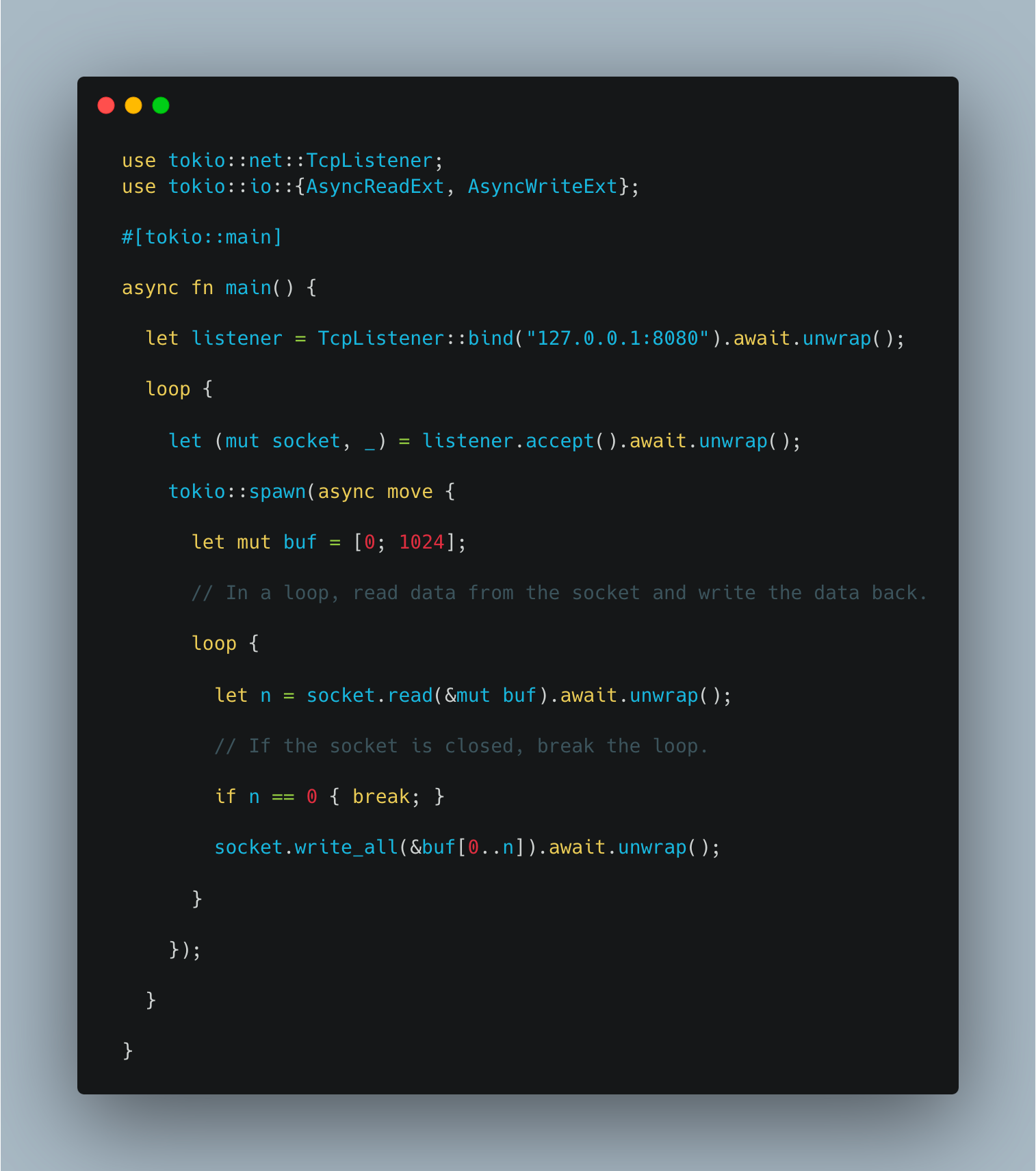 This code awaits a connection, then spawns a new asynchronous task to handle each one, allowing our server to deal with multiple clients concurrently — true to the scalable nature of a startup.