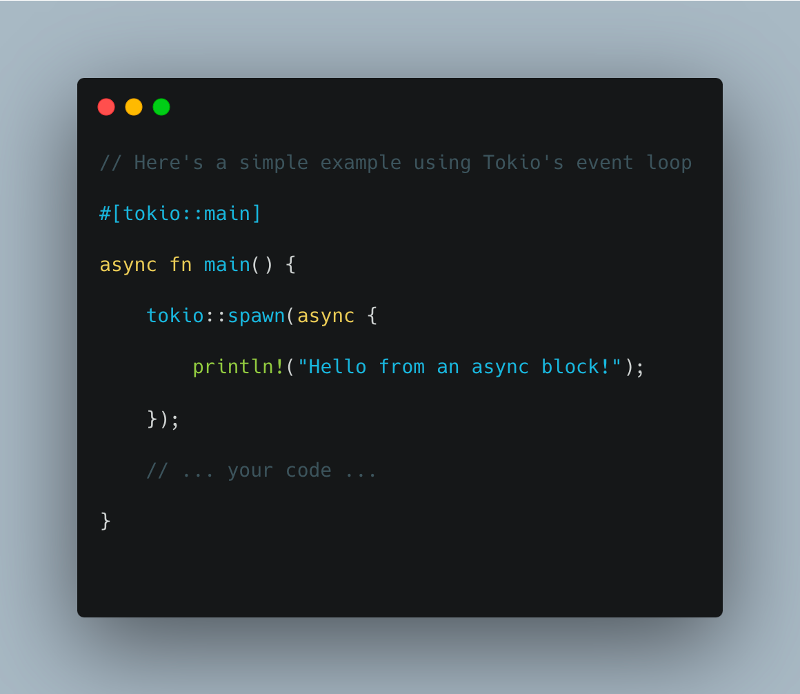 Rust's async/await syntax is integrated with Tokio, offering a much cleaner, more readable approach to asynchronous code. Just as plain, straightforward pitches often work best for convincing investors, straightforward syntax makes your intentions in code clear and easier to maintain.