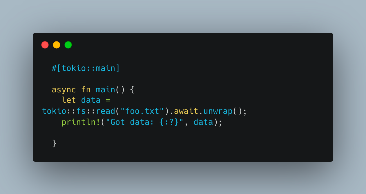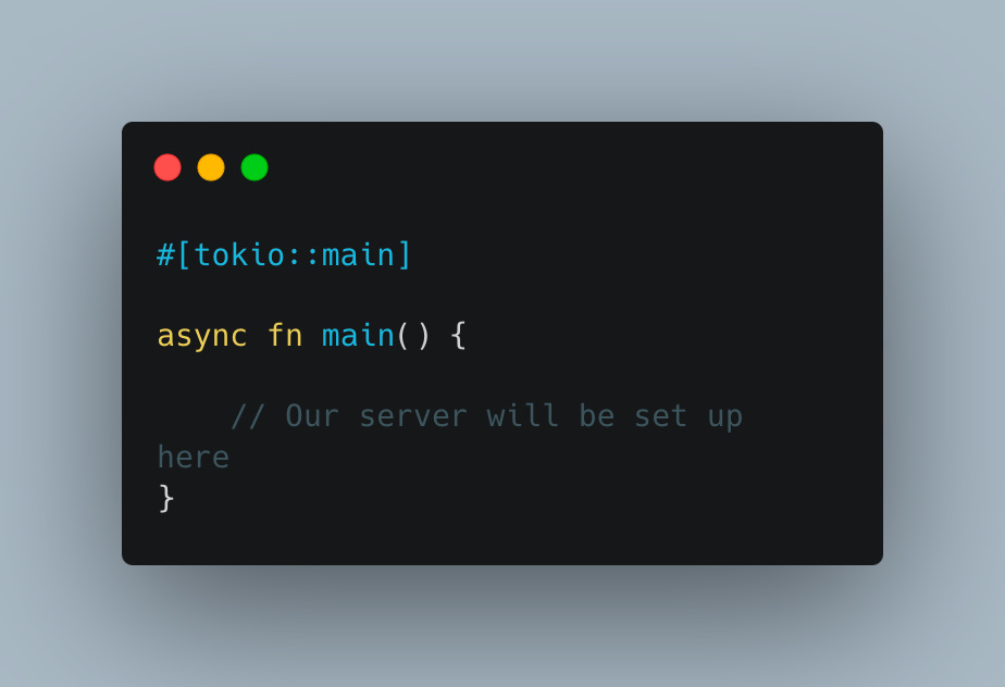 The `#[tokio::main]` macro prepares the asynchronous runtime for our application.